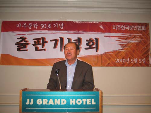 미주문학 통권 50호 특집 출판기념회에서 격려사를 하고 있는 정용진 시인
