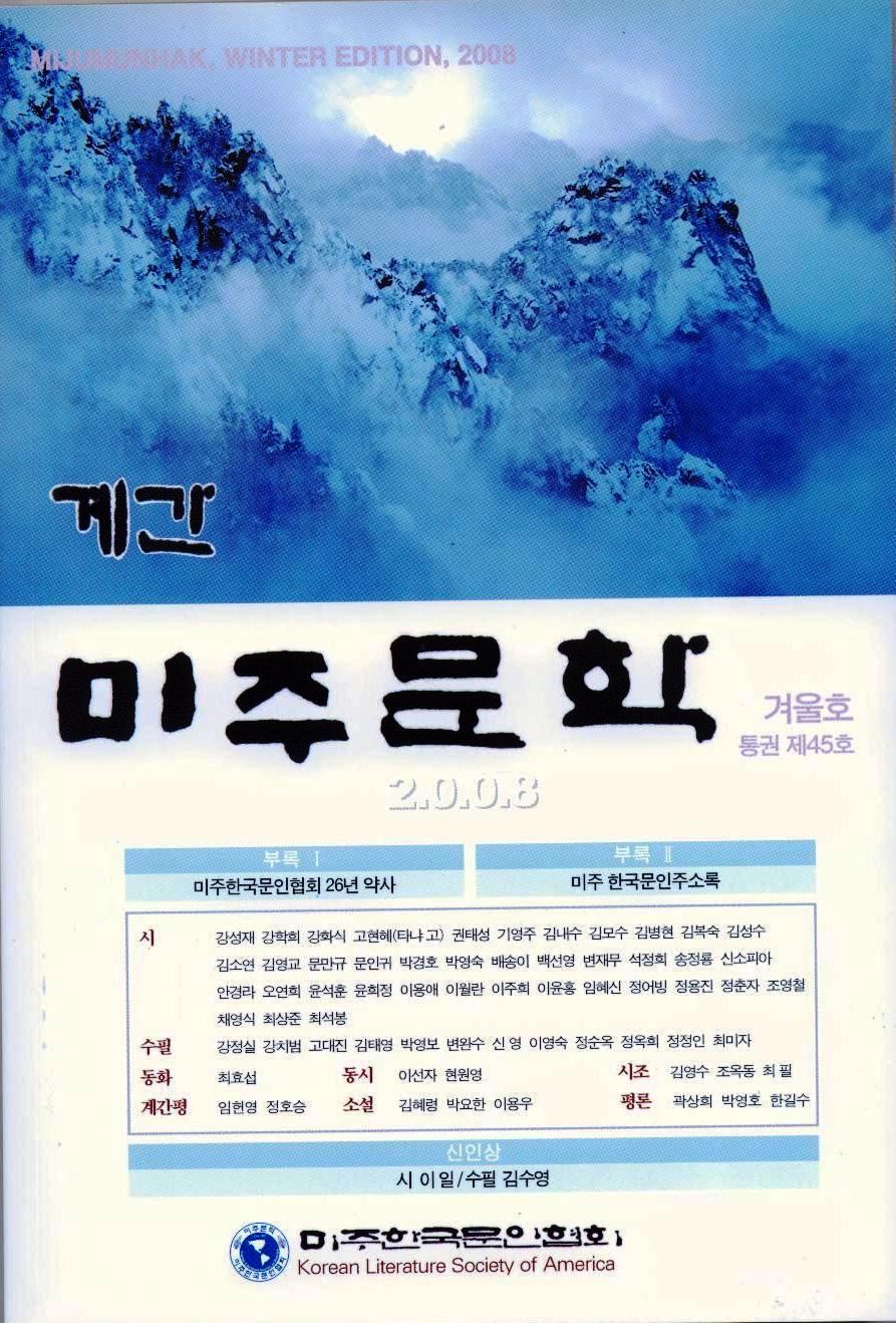 미주한국문인협회[-g-alstjstkfkd-j-] 시; 강성재 시인 외 38인 시조; 김영수 시인 외 2인 수필; 강정실 작가 외 11인 소설; 김혜령 작가 외 2인 평론; 곽상희 작가 외 2인 동화; 최요섭 작가 동시; 이선자 작가 외 1인 계간평; 임헌영(문학평론가) 정호승(시인) 부록1; 미주한국문인협회 26년 약사. 부록2; 미주한국문인 주소록
