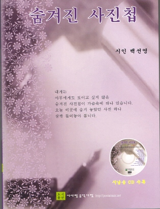 백선영[-g-alstjstkfkd-j-]백선영 시인은 아픔 때문에 시를 쓴다. 그 아픔은 백시인에게만 국한되어있는 아픔은 아니다. 오늘을 살아가는 현대인이면 누구나 겪고 있는 삶 그 자체이지만 백시인은 그 아픔에 남다른 애착으로 의미를 부여하고 있다. - 문인귀시인의 발문중에서 - 내게는 아무에게도 보이고 싶지 않은 숨겨진 사진첩이 가슴속에 하나 있습니다. 오늘 이곳에 숨겨 놓았던 사진 하나 살짝 들어놓아 봅니다. - 작자의 책표지 글에서 - "백선영 문학서재 바로가기"