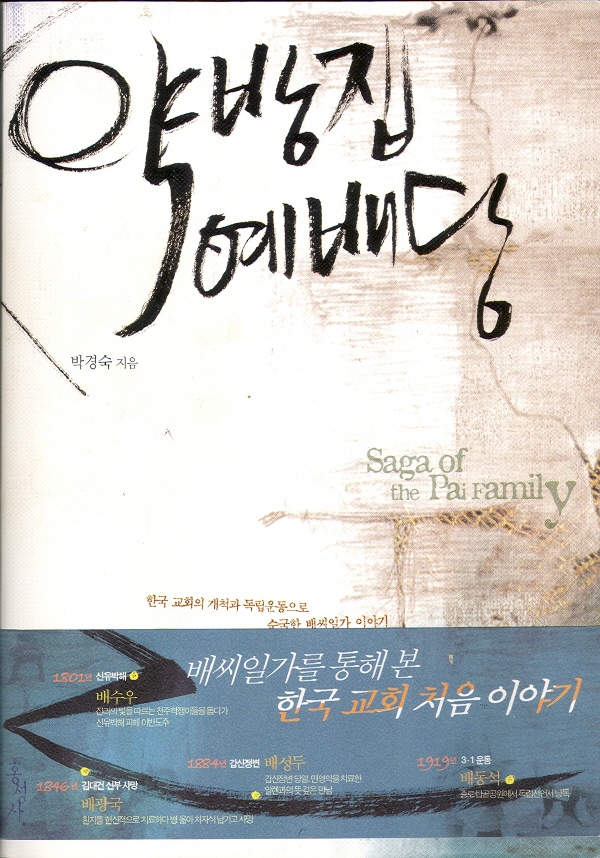 박경숙[-g-alstjstkfkd-j-]역사에서 소설로, 그 치환의 과정과 의미 이 소설은 19세기의 원년, 곧1801년 부터 오늘에 이르기까지, 이백여 년에 걸친 시간적 환경을 바탕에 깔고 출발한다. 그리고 조선조의 충주 관찰사였던 배수우란 인물에서 비롯하여 6대에 걸친 한 가문의 실증적 가족사를 그 내부에 끌어안고 있다. 그런데 이 배씨일가 이야기가 한 가계의 흥망성쇠만을 담론 구조로 하고 있다면, 구태여 이와 같은 단행본으로 출간될 이유도, 또 이글이 쓰일 이유도 없었을 것이다. 이 소설은 근대사의 험난한 파고를 밟아온 한 가문의 생존 기록이며, 동시에 한국의 초대교회 성장과 일제 강점기 독립운동 실상의 핍진하고 처절한 증언으로 채워져 있다. -김종회 문학평론가, 경희대 교수의 '독자를 위하여' 중에서-