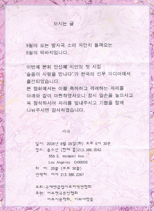 -= IMAGE 2 =- 본협회 회원인 안선혜 시인의 첫시집 <슬픔이 사랑을 만나다>가 출간되었다. 출판기념회일정은 아래와 같으니 부디 많이 오셔서 축하해 주시기 바란다. "관련 기사 바로가기 여기 클릭 "
